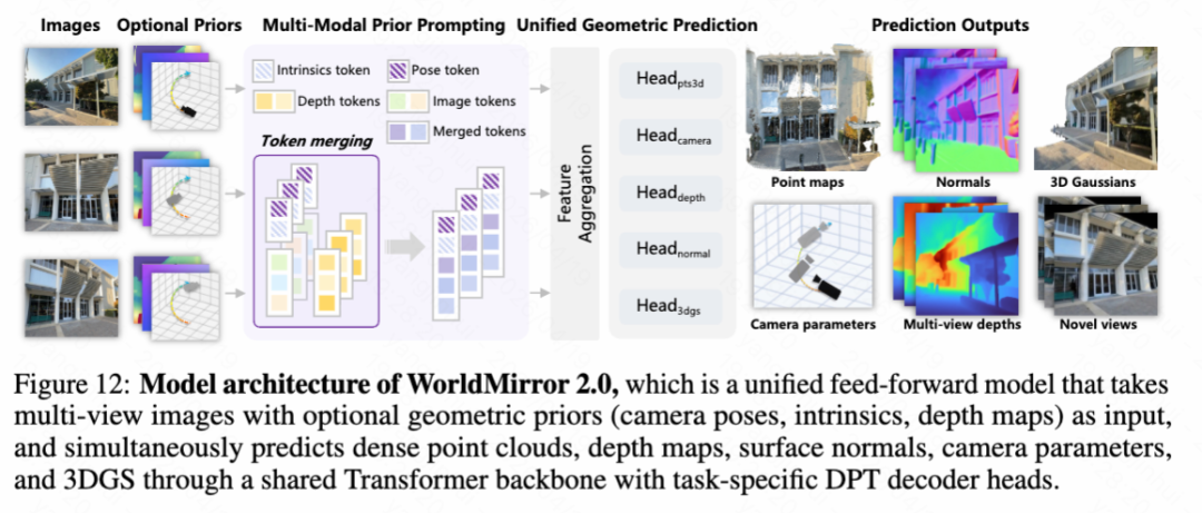 Revisiting WorldMirror 1.0. WorldMirror is a unified feedforward model for comprehensive 3D geometric prediction (see Figure 12 above). Its core design is "any-modality tokenization," which encodes all input modalities, including images, camera poses, intrinsics, and depth maps, into tokens within a unified sequence.
