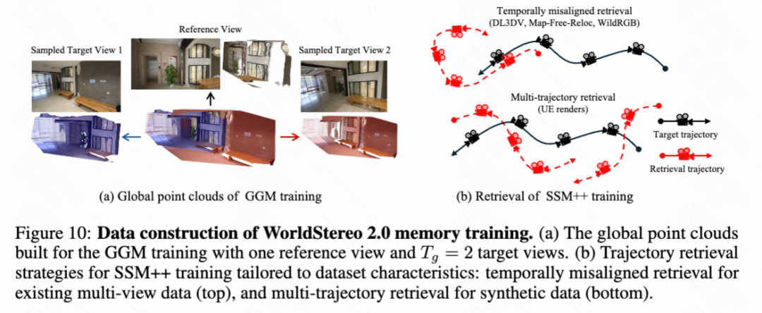 Memory Bank and Retrieval Strategy. During intermediate training, this paper adopts different retrieval strategies to accommodate varying data characteristics, as shown in Figure 10(b) above. This paper employs temporal misalignment retrieval for existing multi-view data. Additionally, this paper constructs a synthetic dataset using UE, where each asset has multiple trajectories. For this synthetic data, this paper adopts multi-trajectory retrieval, selecting the most relevant frames from alternative trajectories based on 3D field-of-view similarity.