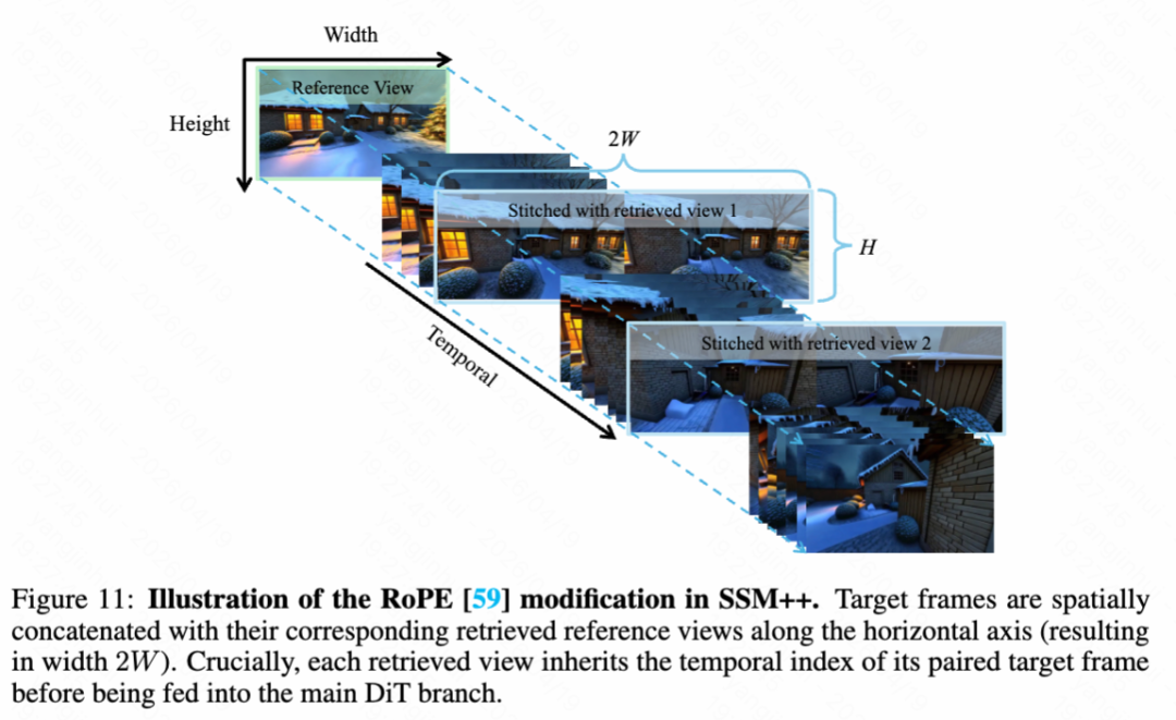 Improved Spatial Stereo Memory (SSM++). In WorldStereo 2.0, this paper enhances this design through SSM++, retaining the core concept of horizontal retrieval stitching while introducing significant improvements. First, this paper abandons the independent memory branch used in WorldStereo and instead integrates retrieved keyframes directly into the main DiT branch (as shown in Figure 7a above). Second, as shown in Figure 11 below, this paper modifies Rotary Position Embedding (RoPE) to accommodate this integration. Each target view is horizontally concatenated with its retrieved counterpart, sharing the same temporal index. Finally, to enhance flexibility, this paper replaces WorldStereo's explicit point map guidance with implicit camera embeddings. Formally, this paper normalizes all input camera poses into a unified world coordinate system and represents them as 7D vectors (quaternions and translations). These vectors are then encoded by a 3-layer MLP into camera tokens, added via zero-initialization to both target and retrieved keyframe features to provide geometric awareness.