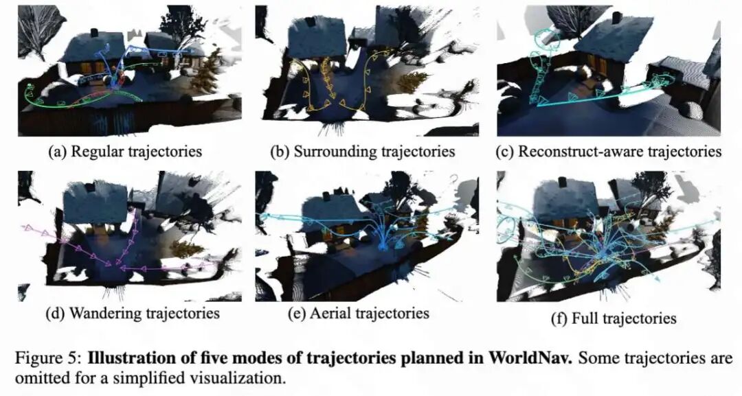 Given panoramic meshes, NavMesh, and 3D semantic landmarks, we design five heuristic trajectory patterns for WorldNav. These trajectories originate from the center of the panorama and aim to comprehensively cover diverse viewpoints while ensuring collision-free movement, as shown in Figure 5 below.