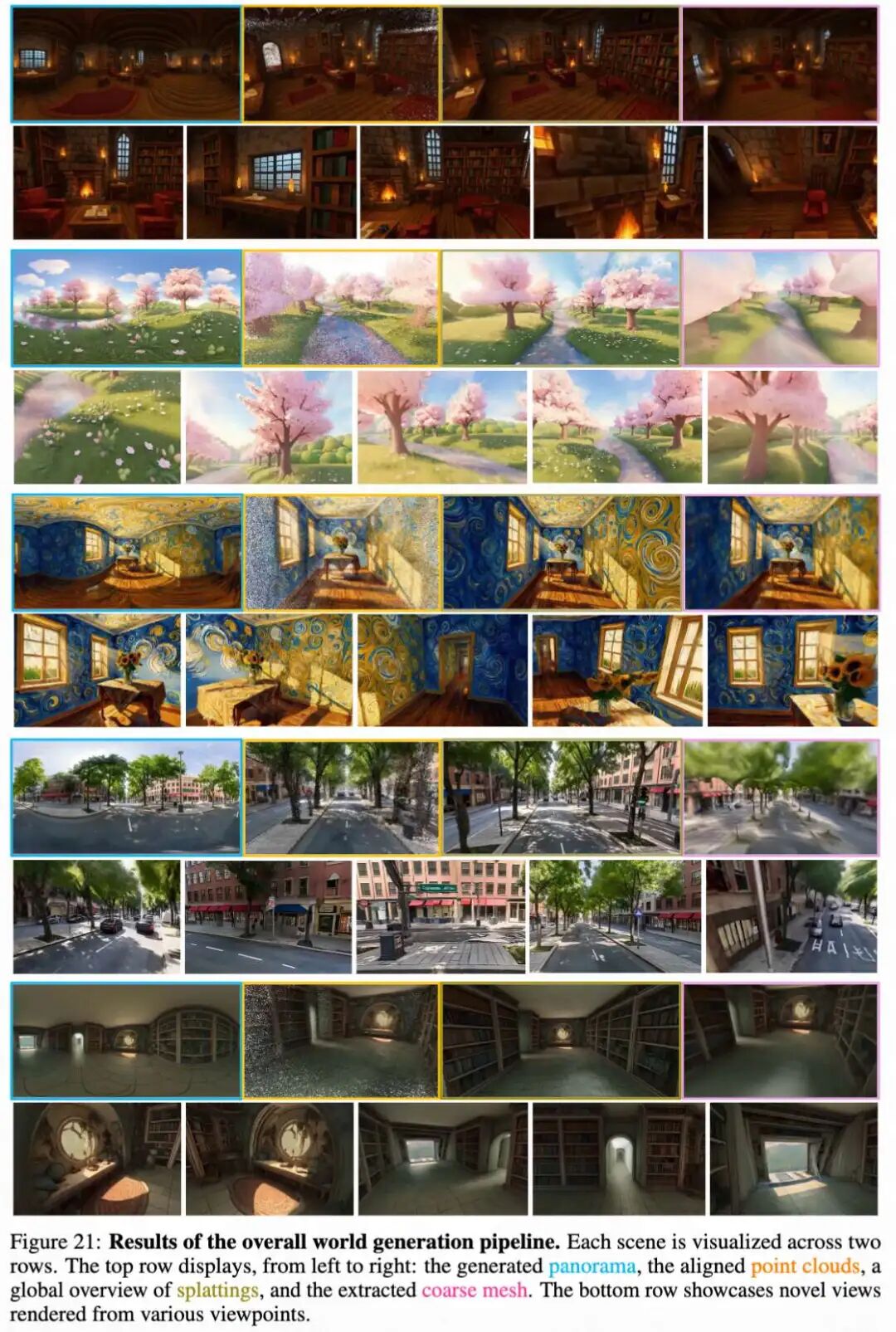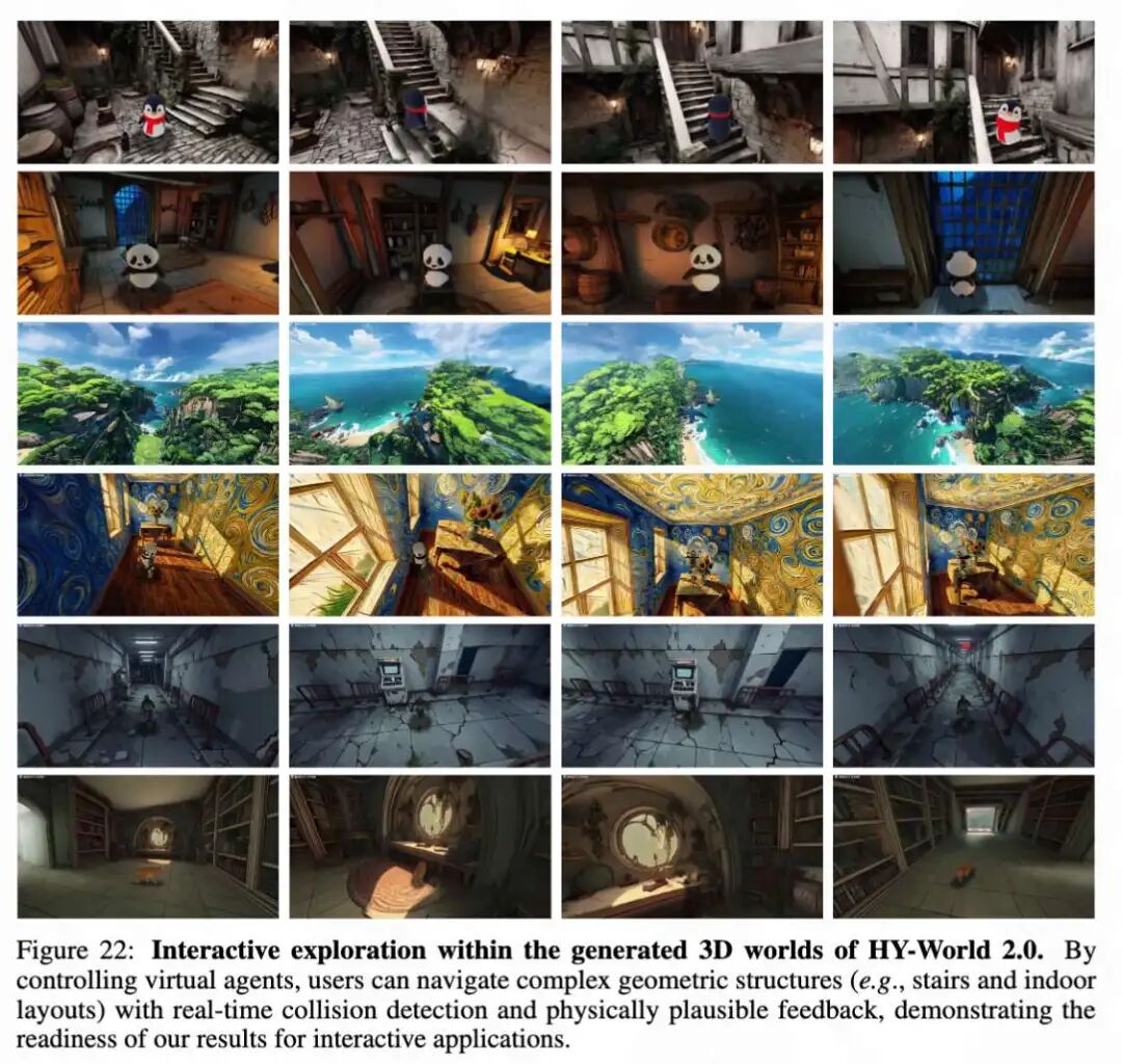 Explorable and Interactive Worlds. As shown in Figure 21 below, HY-World 2.0 generates comprehensive multimodal 3D assets, including panoramas, aligned point clouds for 3DGS initialization, high-fidelity 3DGS renderings, and extracted geometric meshes. More importantly, these rich 3D representations transcend static visualization, serving as the foundational environment for explorable and interactive 3D worlds (see Figure 22 below), which demonstrates users interactively exploring the 3D world generated by HY-World 2.0, including virtual agent navigation and real-time collision detection.