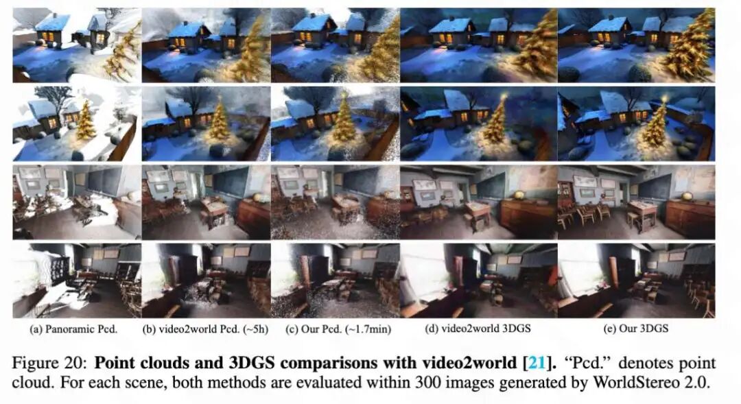 Reconstruction and alignment. Although the preceding sections confirm the effectiveness of WorldMirror 2.0's point cloud expansion under known camera poses, this paper further evaluates the overall composition pipeline against the contemporary world reconstruction method video2world in Figure 20 below. To ensure fair comparison, both methods are evaluated on 300-view images generated by WorldStereo 2.0. As shown in Figure 20 below, although video2world generates impressive point clouds via iterative closest point (ICP) through feature matching, the process is inherently difficult to parallelize, resulting in computational overhead of approximately 5 hours per scene. In contrast, this paper's lightweight linear alignment fully leverages camera pose priors, achieving comparable reconstruction quality in under 2 minutes.