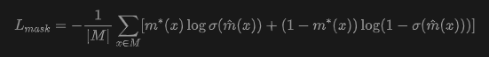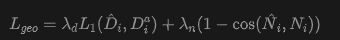 where is the predicted depth map, while and are the x and y components of the predicted normal map, respectively. The depth mask prediction head outputs a validity logit for each pixel and is trained using binary cross-entropy loss: