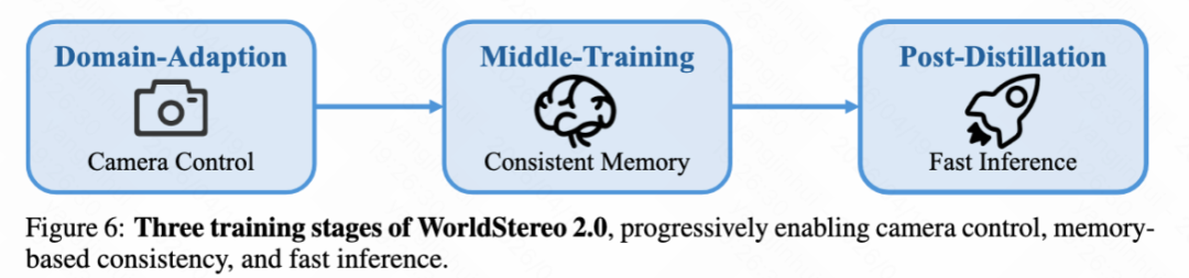 Task Description. Building upon high-quality panoramas and broad-coverage camera trajectories, we propose WorldStereo 2.0. As an upgraded version of WorldStereo 1.0 [62], it leverages camera-guided video generation to synthesize a large number of novel views for world expansion. As shown in Figure 6 below, the training process comprises three stages aimed at achieving camera control, memory-based consistency, and efficient inference, respectively.