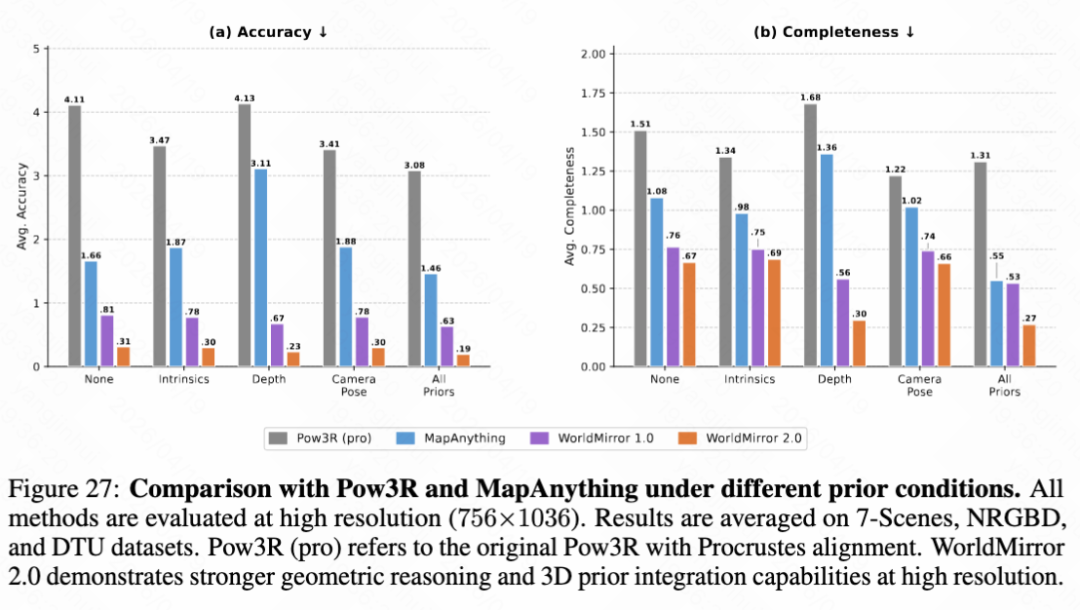 Geometric Prior Injection. A notable feature of WorldMirror is its ability to flexibly integrate geometric priors. This paper compares the performance of WorldMirror 1.0 and 2.0 with prior-guided methods Pow3R and MapAnything under different prior conditions at high resolution (as shown in Figure 27 below). WorldMirror 2.0 consistently outperforms all alternatives, showing the greatest improvement under camera conditions and all prior settings.