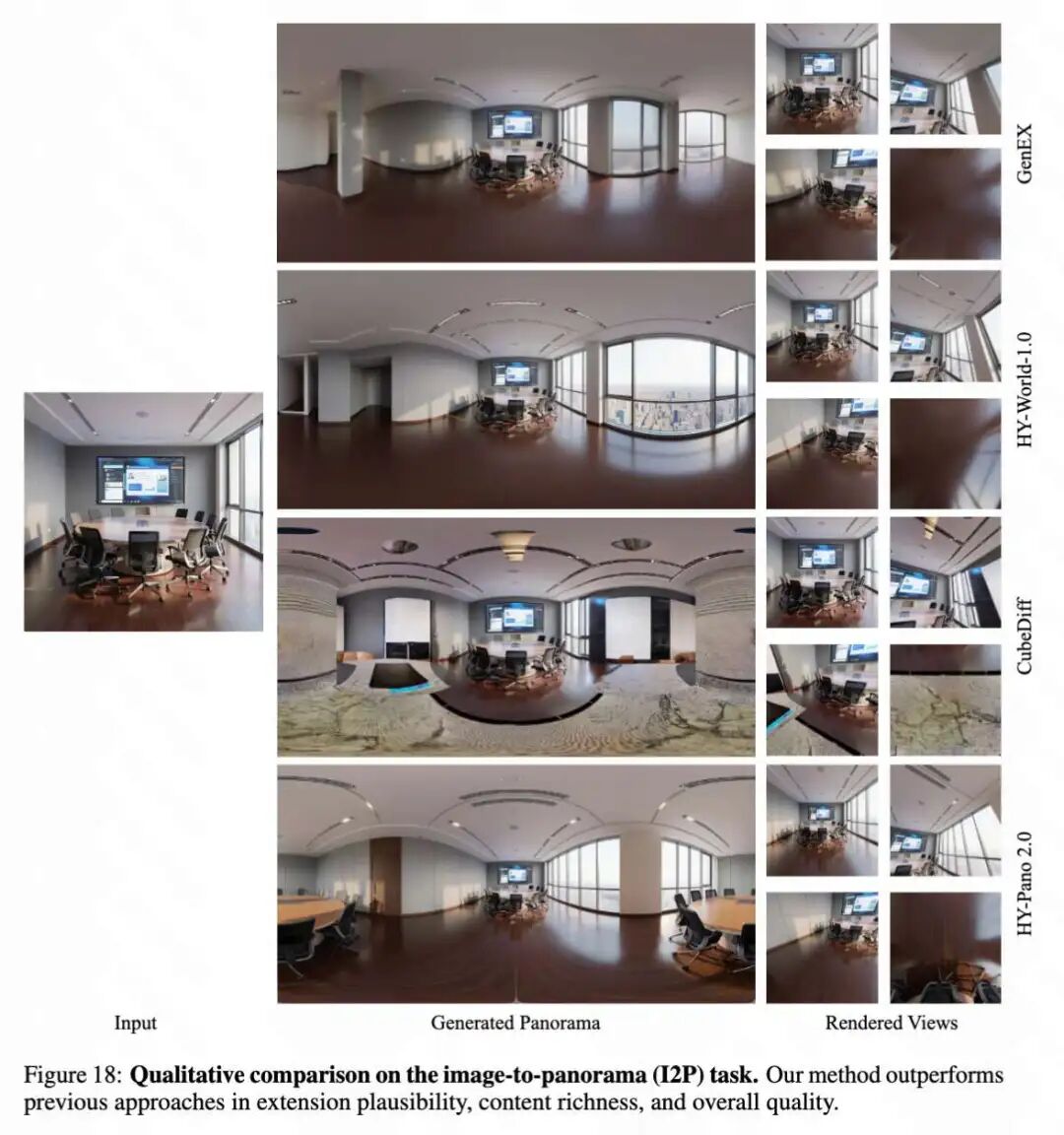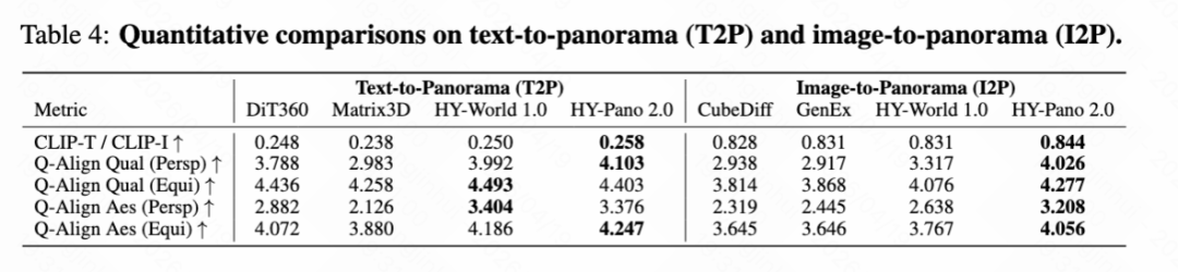 Quantitative results. The quantitative comparison for T2P and I2P tasks is shown in Table 4 below. Generated panoramas are evaluated using multiple complementary metrics. CLIP-T (T2P) and CLIP-I (I2P) measure text-image and image-image alignment, respectively. Q-Align provides perceptual quality (Qual) and aesthetic (Aes) scores based on large multimodal models aligned with human ratings. As shown in Table 4 below, HY-Pano 2.0 achieves the best scores on most metrics for both tasks. These results demonstrate that HY-Pano 2.0 adheres more strongly to input signals (text prompts or reference images), exhibits higher fine-detail quality, and improves aesthetic scores compared to previous methods.