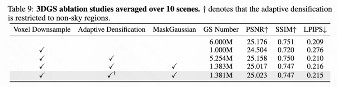 Gaussian radiance fields. This paper conducts an ablation study of each component in the proposed 3DGS pipeline across 10 scenes, evaluated on a 20-view validation set (Table 9 below). Integrating MaskGaussian resolves this trade-off: redundant Gaussian points in low-frequency regions are pruned, reducing their count by 73.7% (from 5.254M to 1.383M), while PSNR only decreases by -0.14 dB.