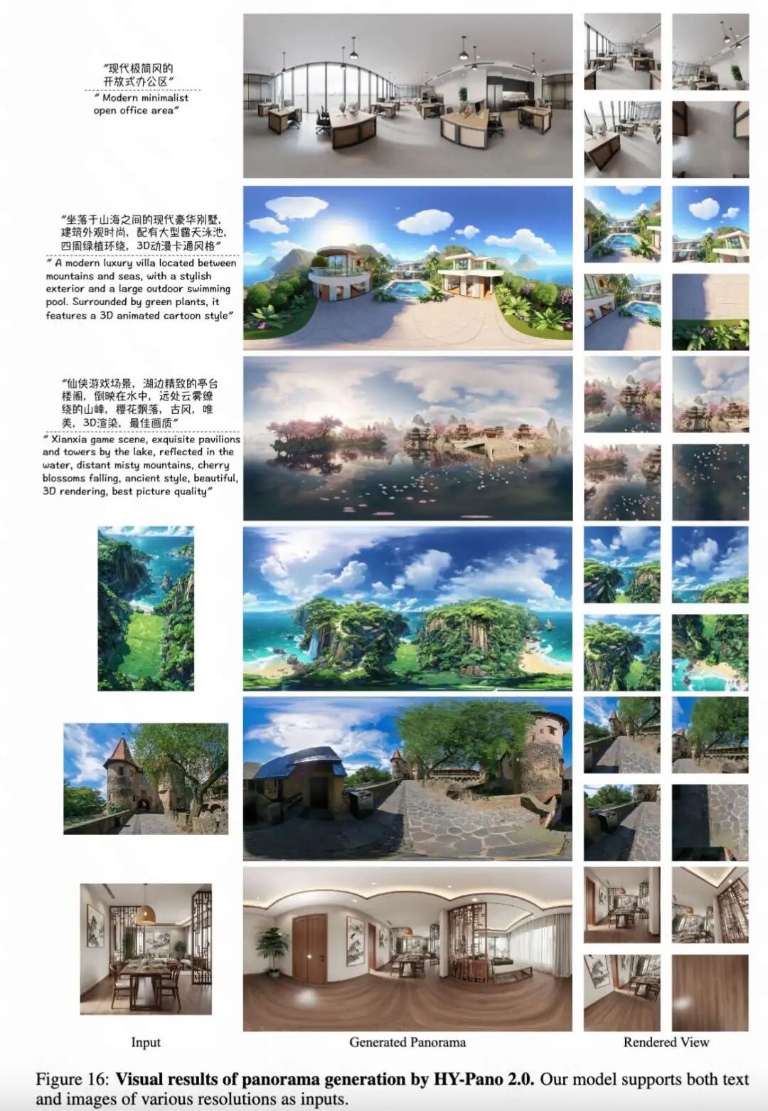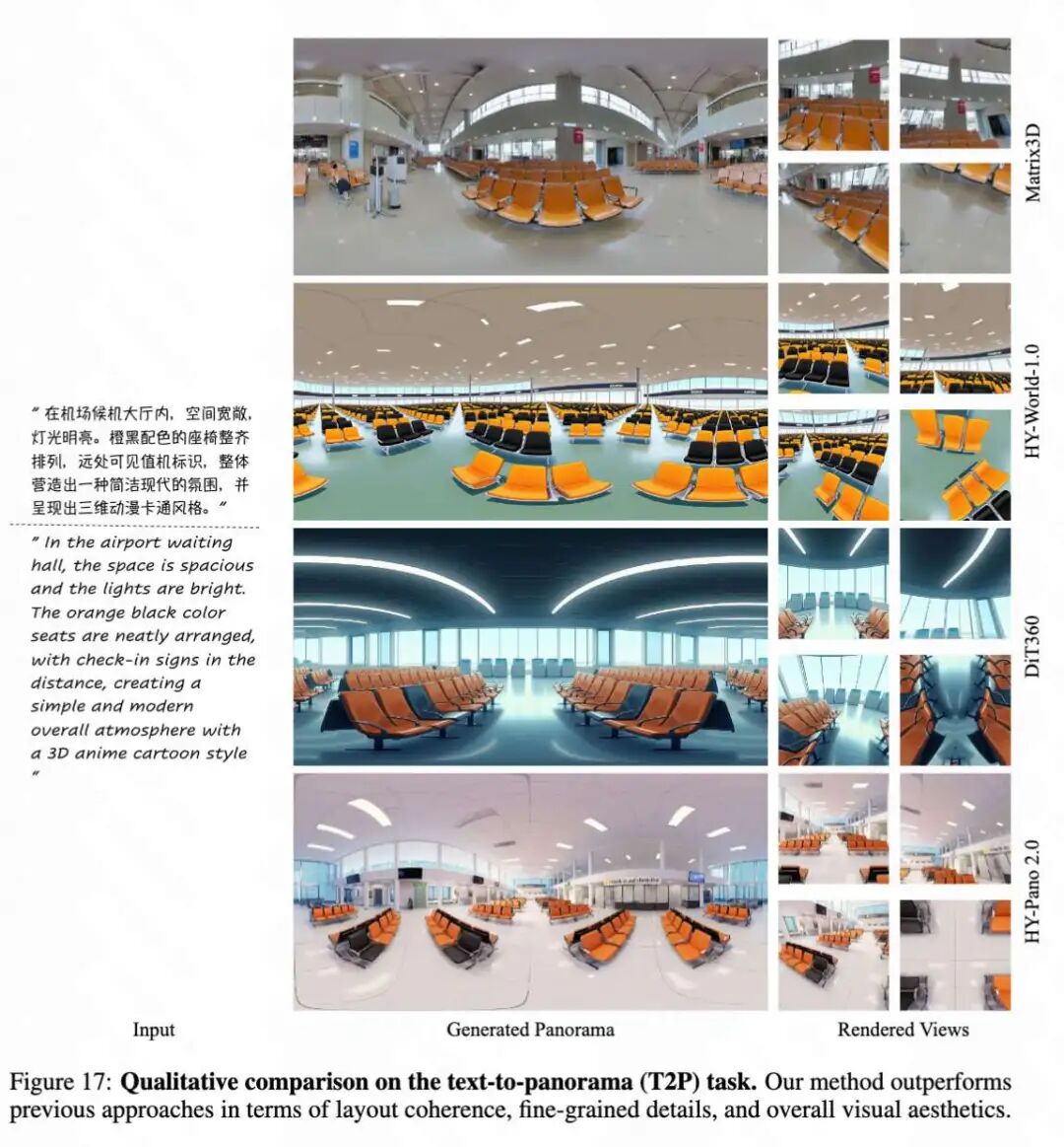 Qualitative results. First, some panoramas generated conditioned on image and text inputs are presented in Figure 16 below. Then, qualitative comparisons for T2P and I2P are shown in Figures 17 and 18 below, respectively. Compared to existing methods, panoramas generated by HY-Pano 2.0 exhibit more structurally coherent layouts, demonstrating reasonable spatial arrangements and consistent geometric structures across the full 360° field of view. Notably, it generates finer details, including sharper textures, clearer object boundaries, and richer high-frequency content, resulting in more realistic and visually appealing panoramas.