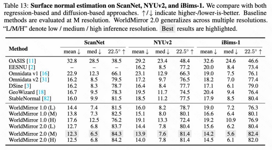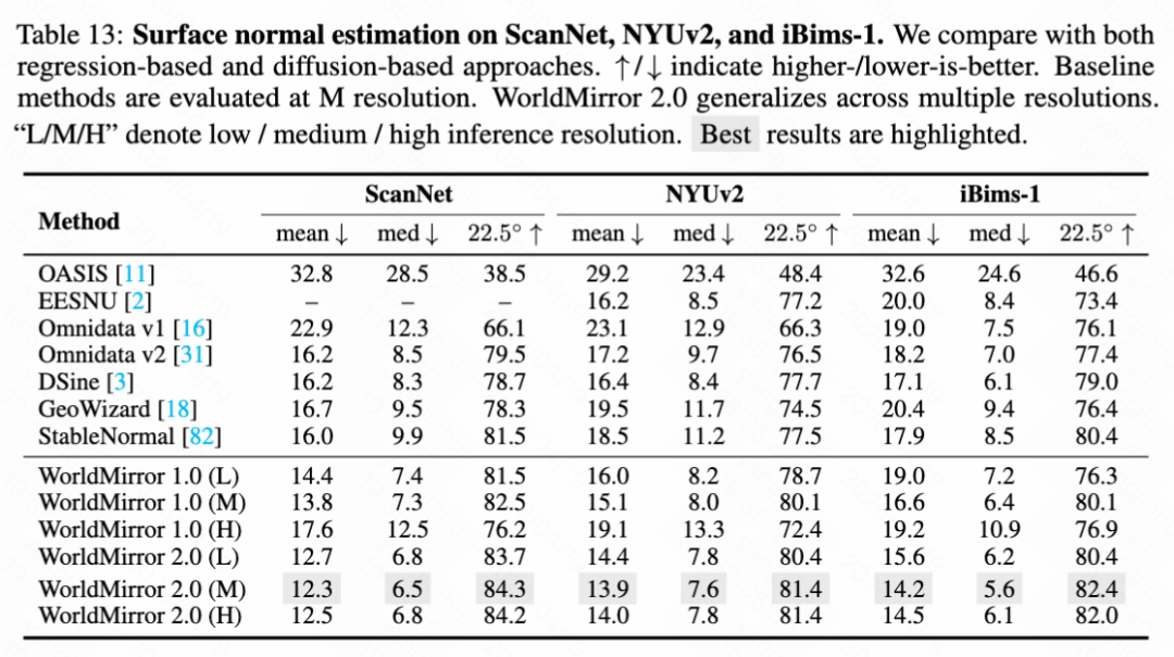 Surface Normal Estimation. Following [3], this paper evaluates surface normal estimation on ScanNet, NYUv2, and iBims-1. As shown in Table 13 below, WorldMirror 2.0 achieves the best results on all three benchmarks at medium resolution, surpassing specialized single-task methods.