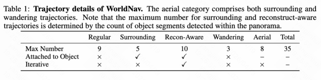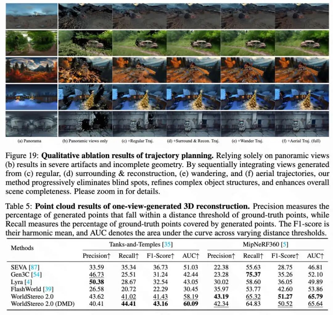 This paper conducts qualitative comparisons in Figure 19 below to intuitively demonstrate the necessity of each trajectory planning component. Training 3DGS solely on panoramic views (Figure 19b) inevitably leads to substantial geometric holes and poor rendering quality. By sequentially integrating views from different trajectories, scene completeness progressively improves. The 3D reconstruction point cloud results generated from single views are shown in Table 5 below, which evaluates point cloud precision, recall, F1-score, and AUC for various methods on the Tanks-and-Temples and MipNeRF360 datasets, where WorldStereo 2.0 and its DMD variant excel on most metrics. The trajectory details of WorldNav are shown in Table 1 below, which outlines the maximum numbers and characteristics of five trajectory modes: regular, orbit, reconstruction-aware, wandering, and aerial.