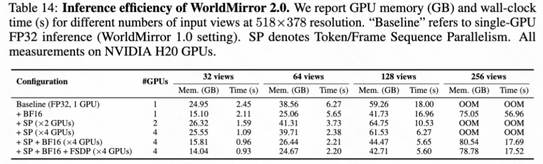 Inference Efficiency. This paper benchmarks the inference efficiency optimizations introduced for WorldMirror 2.0 in the preceding text. Table 14 below reports the per-GPU memory consumption (GB) and wall-clock inference time (seconds) for different numbers of views at a resolution of 518×378 on an NVIDIA H20 GPU. The full combination of SP, BF16, and FSDP across 4 GPUs achieves the best trade-off.