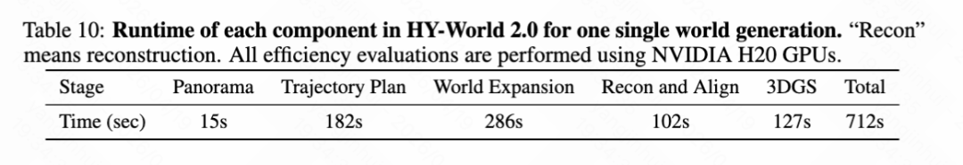 Runtime analysis. The overall runtime of HY-World 2.0 is evaluated on an NVIDIA H20 GPU, as detailed in Table 10 below, which lists the time costs for each stage, including panoramic generation, trajectory planning, world expansion, reconstruction and alignment, and 3DGS. By integrating systematic efficiency optimizations, the end-to-end pipeline for generating complete 3D worlds is accelerated, requiring only 10 minutes.