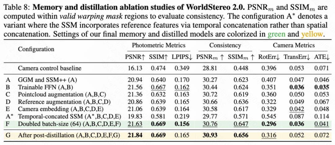Ablation study of memory training and distillation. This paper comprehensively evaluates memory training and post-distillation in Table 8 above. Integrating GGM and SSM++ (Configuration A) significantly improves photometric quality and multi-trajectory consistency. Finally, after applying DMD post-distillation (Configuration G), the model not only maintains comparable camera control capabilities but even slightly improves photometric and consistency metrics.