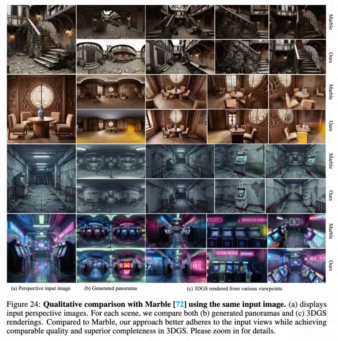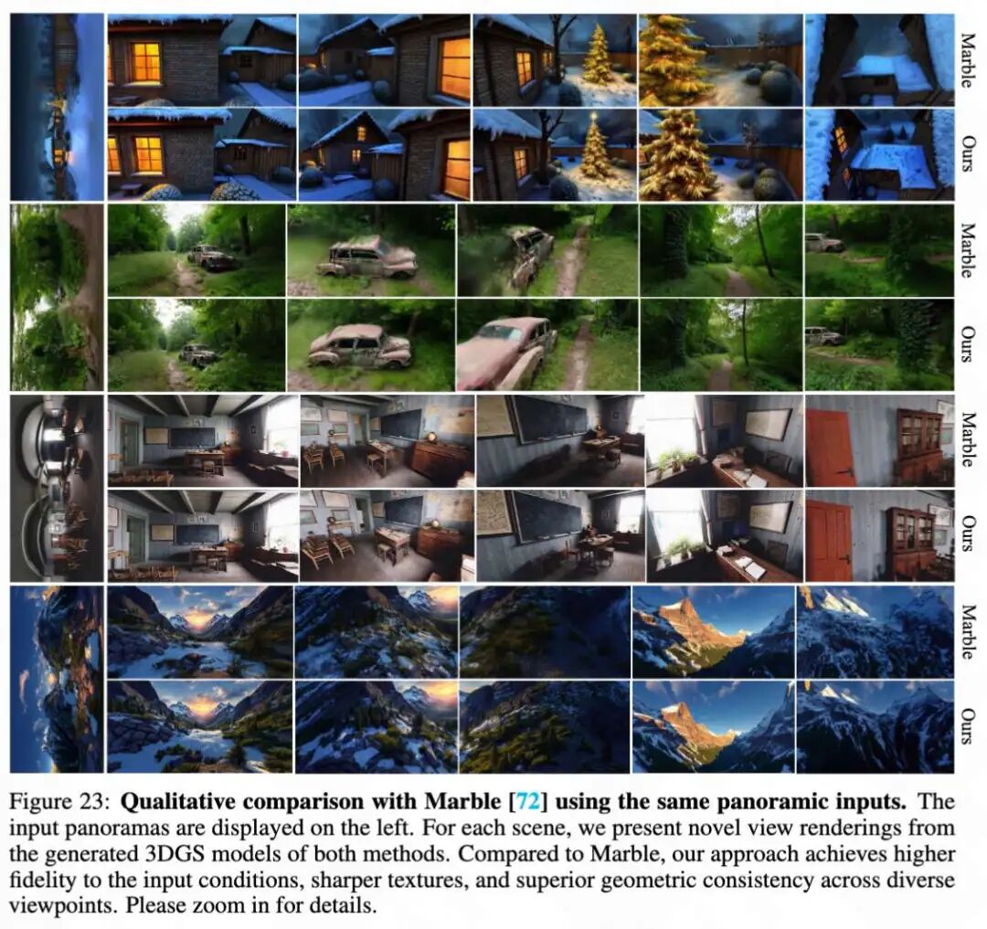 Comparison with state-of-the-art. This paper compares the method with the closed-source commercial world model Marble. Comparisons are conducted under two settings: using identical panoramic inputs (Figure 23 below) and using identical perspective conditions (Figure 24 below). In contrast, this paper's method obtains high-fidelity results that strictly adhere to the provided conditions. Furthermore, this paper's generations outperform Marble in detail preservation and geometric consistency across novel views.