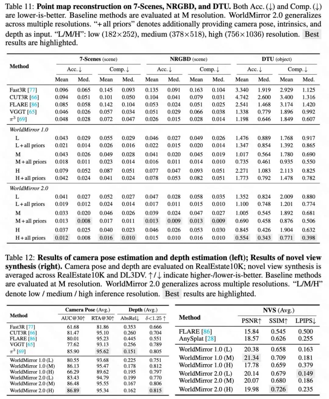 This paper evaluates WorldMirror 2.0 as a standalone reconstruction foundation model on a comprehensive benchmark covering point map reconstruction (as shown in Table 11 below), camera pose estimation, depth estimation, novel view synthesis (as shown in Table 12 below), and surface normal estimation (as shown in Table 13 below). All tasks are assessed at three inference resolutions: low (189×259), medium (378×518, the default setting for WorldMirror 1.0), and high (756×1036), to verify the resolution generalization capability achieved through normalized position encoding.