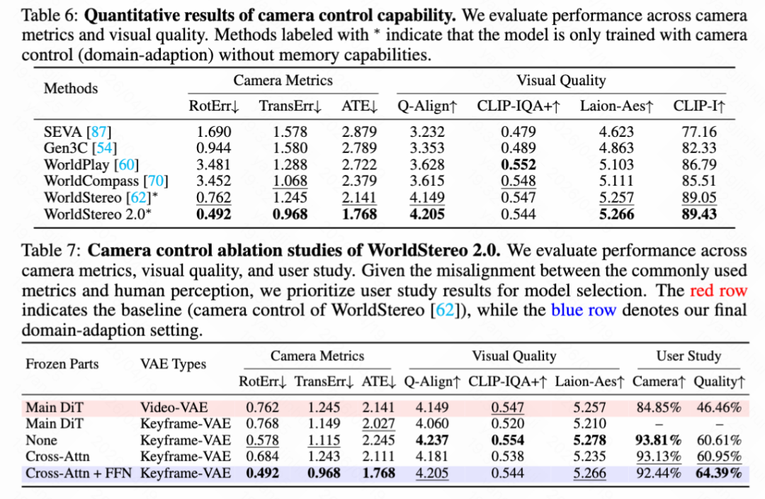 Results of camera control capabilities. This paper quantitatively evaluates WorldStereo 2.0's camera control capabilities in Table 6 below, while conducting an ablation study in Table 7 below. Both evaluations use 100 out-of-domain images with challenging trajectories selected from [15]. WorldStereo 2.0 outperforms all video-based competitors with the lowest error rates across all camera metrics. Furthermore, this paper provides qualitative comparisons in Figure 8 below, further supporting this conclusion, which demonstrates that Keyframe-VAE exhibits better appearance consistency and fidelity in reconstruction and novel view generation compared to Video-VAE.