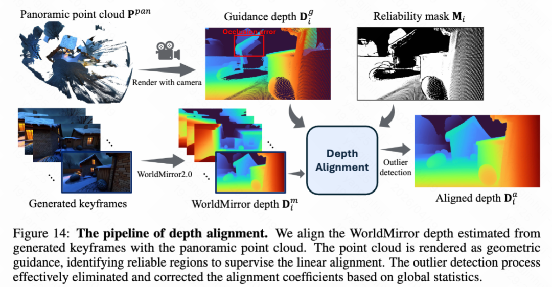 Depth Alignment. This paper proposes a robust alignment strategy that leverages the panoramic point cloud as geometric guidance to correct WorldMirror depth into aligned depth maps . Formally, this paper renders from the viewpoint of to obtain sparse guidance depth , as shown in Figure 14 below. The alignment process is formulated as: