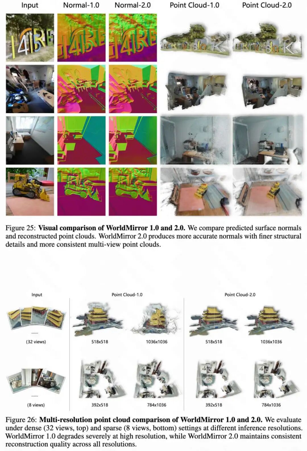 Qualitative Results. This paper presents visual comparisons between WorldMirror 1.0 and 2.0 in Figures 25 and 26 below. As shown in Figure 25, WorldMirror 2.0 generates sharper, geometrically more coherent surface normals. The figure intuitively demonstrates that WorldMirror 2.0 has finer structural details and higher consistency than WorldMirror 1.0 in terms of surface normals and reconstructed point clouds. Figure 26 further examines multi-resolution robustness, showing that WorldMirror 1.0 exhibits severe geometric degradation at high resolution, while WorldMirror 2.0 maintains stable and coherent reconstruction across all tested resolutions.