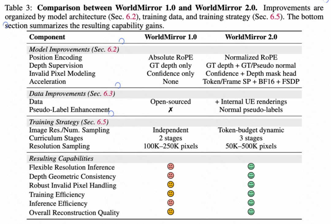 Model Improvements. As summarized in Table 3 above, this paper introduces three key model-level improvements in WorldMirror 2.0: normalized position encoding for flexible-resolution inference, explicit normal-based supervision for depth via a depth-to-normal loss, and a dedicated depth mask prediction head for robust handling of invalid pixels. The depth-to-normal loss is defined as: