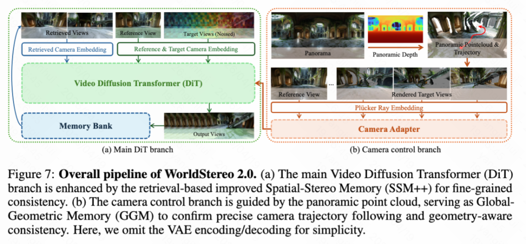 Explicit Camera Control. Following [8, 62], WorldStereo 2.0 is built upon a pre-trained video DiT and integrates a lightweight Transformer-based camera adapter trained from scratch, as shown in Figure 7(b) above. Formally, WorldStereo 2.0 fuses camera Plücker rays and point clouds as complementary camera guidance to enable explicit and precise camera control for subsequent 3D reconstruction. During domain adaptation, this paper uses only point clouds (N ≤ HW, after float filtering) extracted from reference views rather than full-scene point clouds. This paper warps them to each target view to obtain , represented as: