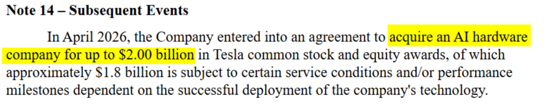 In the late hours of April 23, 2026, Tesla filed a quarterly report with the SEC. Buried in a footnote on the last page, in less than two lines of text, a transaction was disclosed: Tesla agreed to acquire an AI hardware company for up to $2 billion, paid entirely in common stock and equity incentives, with approximately $1.8 billion contingent upon achieving technical milestones.