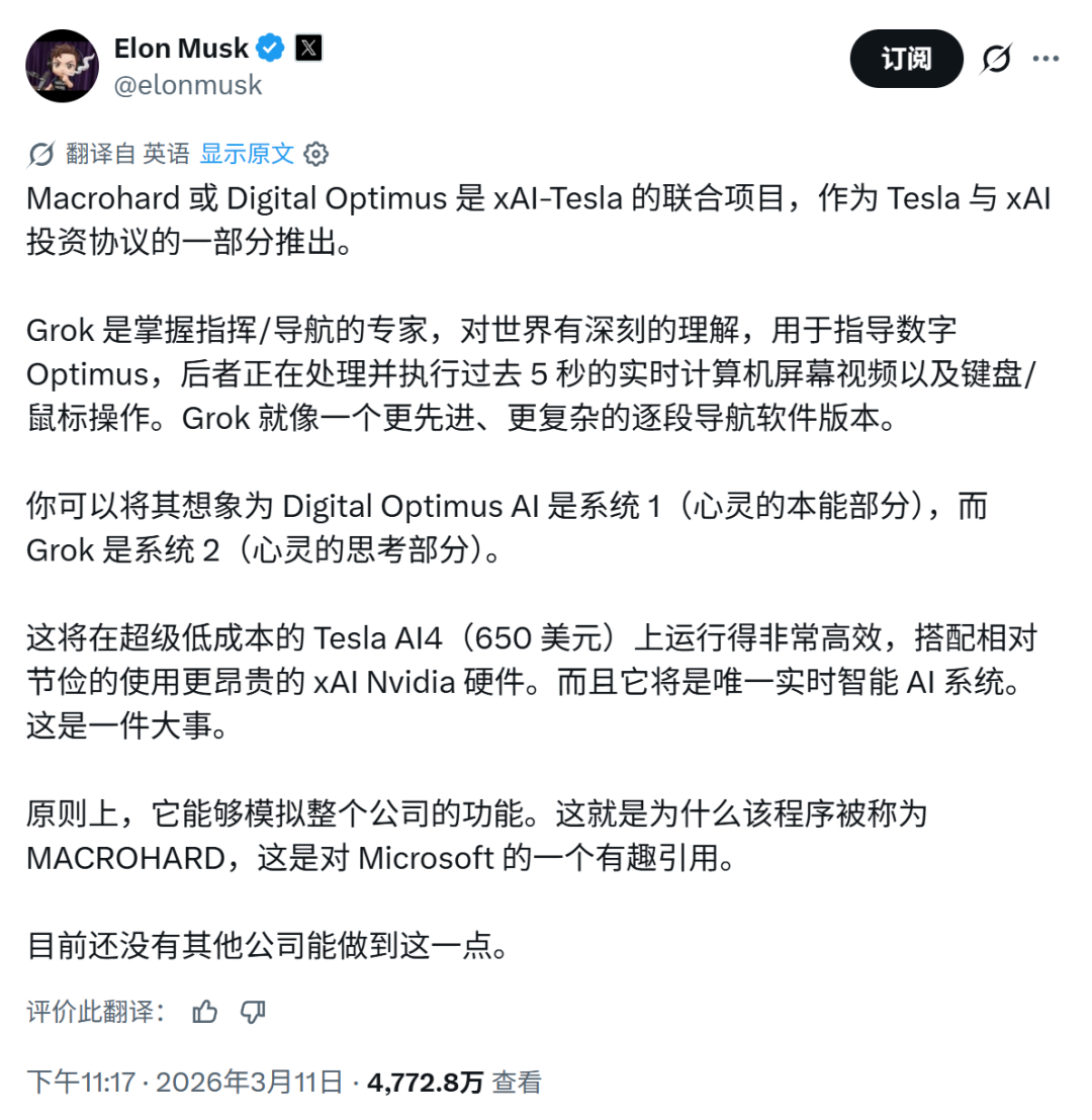 March 11: Musk confirmed that Tesla and xAI's joint project "Macrohard" (translated as "Jù Yìng" by Chinese media) officially entered full-scale advancement. Led by Tesla AI software vice president Ashok Elluswamy, the project aims to simulate a complete software company's functions using AI—Grok serves as the high-level decision-maker, while Tesla's AI agents handle real-time screen, keyboard, and mouse operations to execute specific software development tasks.