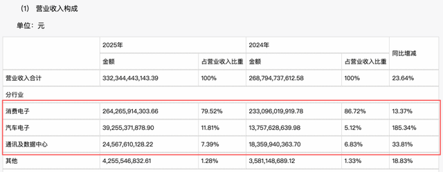 Specifically, consumer electronics remain the company's anchor but with a declining share. In 2025, the consumer electronics business achieved revenue of 264.266 billion yuan, up 13.37% year-on-year, but its proportion of total revenue dropped to 79.52%, down about 7 percentage points from previous levels.