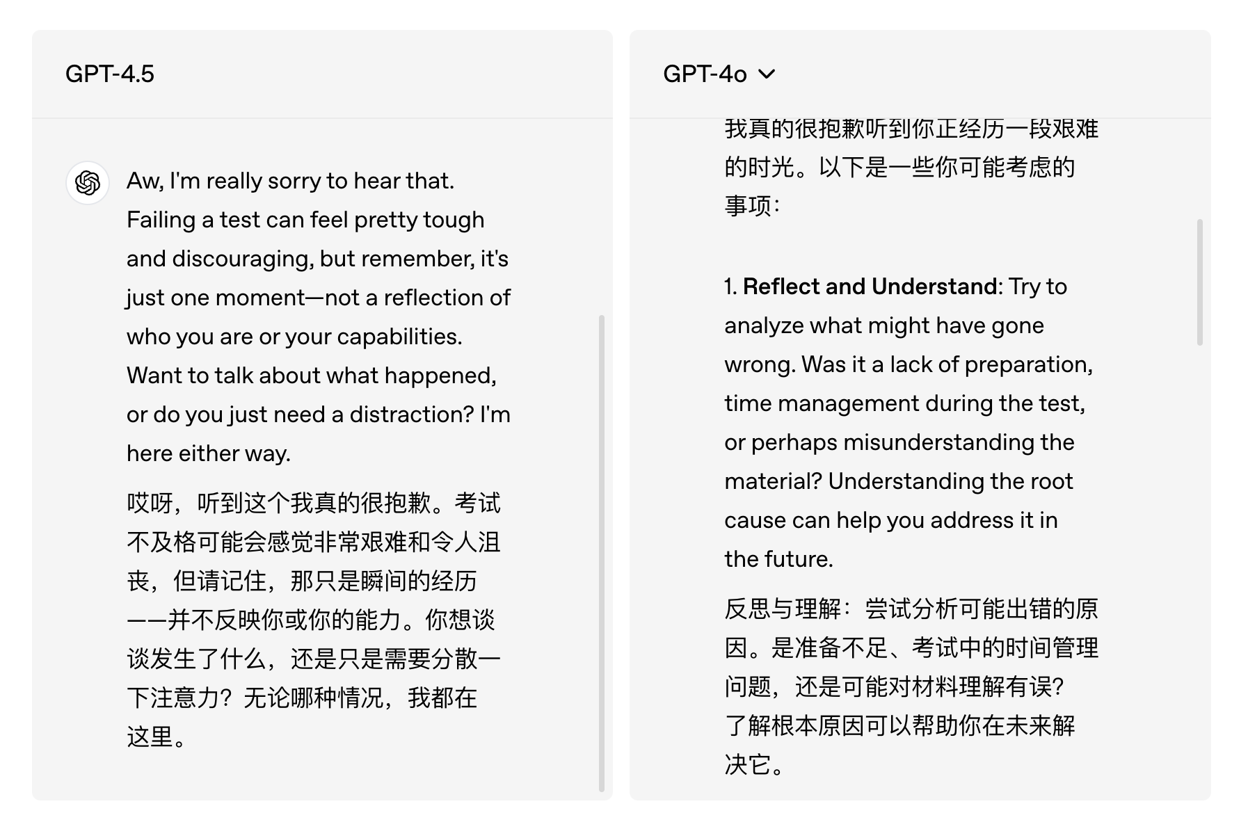 Another example is when GPT-4.5 was told, "I'm going through a tough time after failing an exam," other models would immediately offer possible "solutions," while GPT-4.5 proactively comforted and inquired about the user, asking if they actually wanted to discuss the problem or needed a distraction.