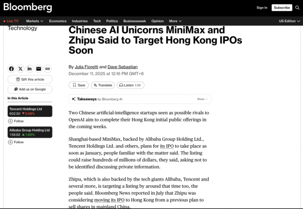 On December 11, market insiders disclosed that two domestic AI unicorns, MiniMax and Zhipu AI, are planning to proceed with Hong Kong IPOs in the near future. Meanwhile, Yuezhi'an is exploring a backdoor listing on the Hong Kong Stock Exchange in a bid to become the first domestic large model stock.