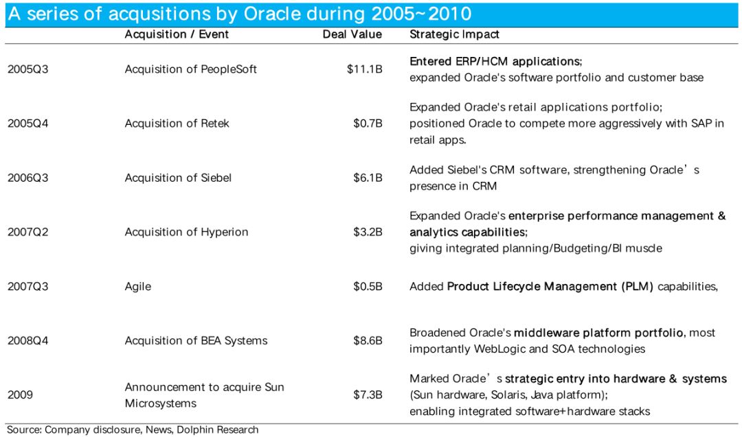 Through these acquisitions, Oracle rapidly strengthened its technological capabilities and business scale in enterprise management software, becoming the second-largest player after SAP.