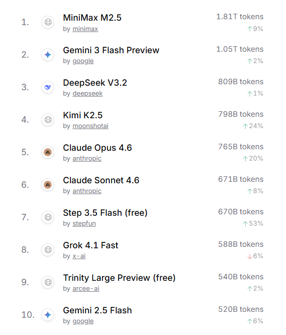 Recent data from OpenRouter reveals that MiniMax’s M2.5, DeepSeek’s V3.2, Moonshot AI’s Kimi K2.5, StepFun’s Step 3.5 Flash (free), and Zhipu’s GLM 5 have all ranked in the Top 10 for model Token usage, collectively accounting for half of the list.