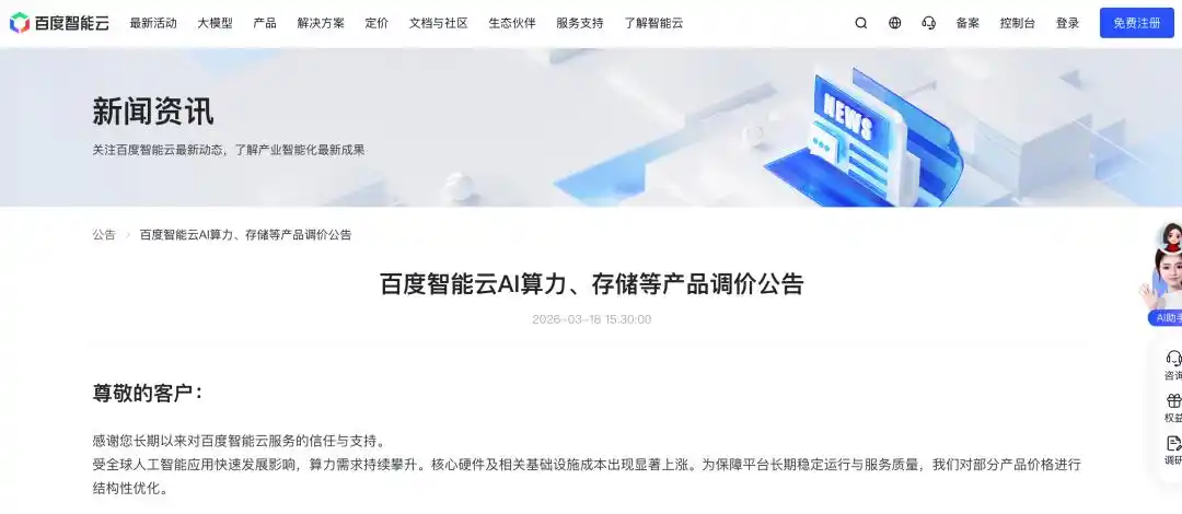 That same afternoon, Baidu Intelligent Cloud released a similar price adjustment announcement, stating that starting from 0:00 on April 18, 2026, it would optimize prices for its AI-related products.