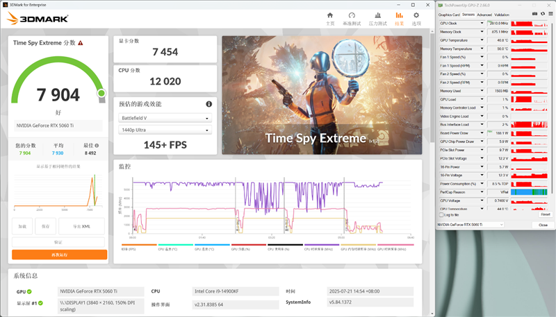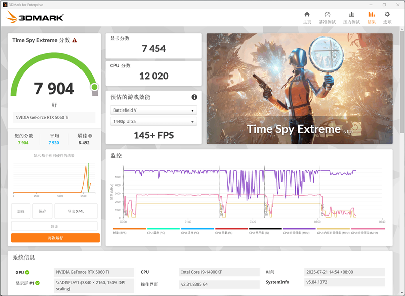 In the 3DMark Time Spy Extreme (DX12+4K rendering resolution) test, the overall score was 7904, with a graphics card score of 7454.