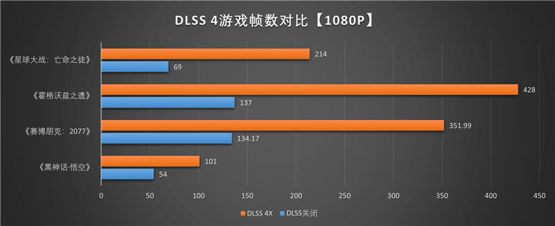 In Hogwarts Legacy, with DLSS 4's highest 4X level multi-frame generation enabled, the test frame rate was 296 at 2K resolution and 428 at 1080P resolution.