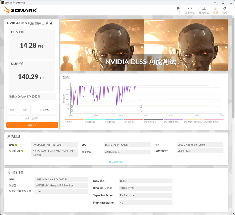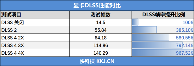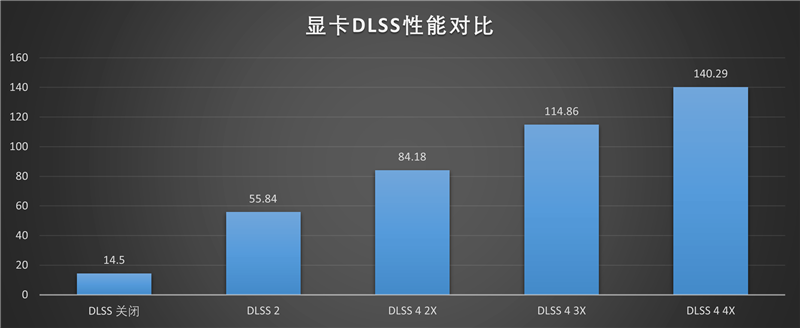 In the 3Dmark NVIDIA DLSS feature test, the frame rate was around 14.5FPS with DLSS 4 off, increasing to 84.18FPS with DLSS 4 2x enabled, 114.86FPS with DLSS 4 3x enabled, and 140.29FPS with DLSS 4 4x enabled.