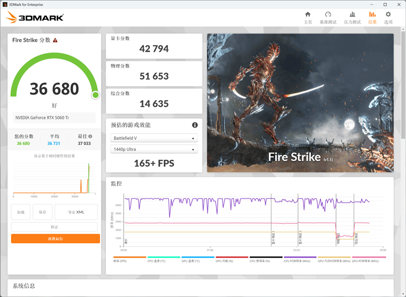 In the 3DMark Fire Strike (DX11+1080P rendering resolution) test, the overall score was 36680, with a graphics card score of 42794.