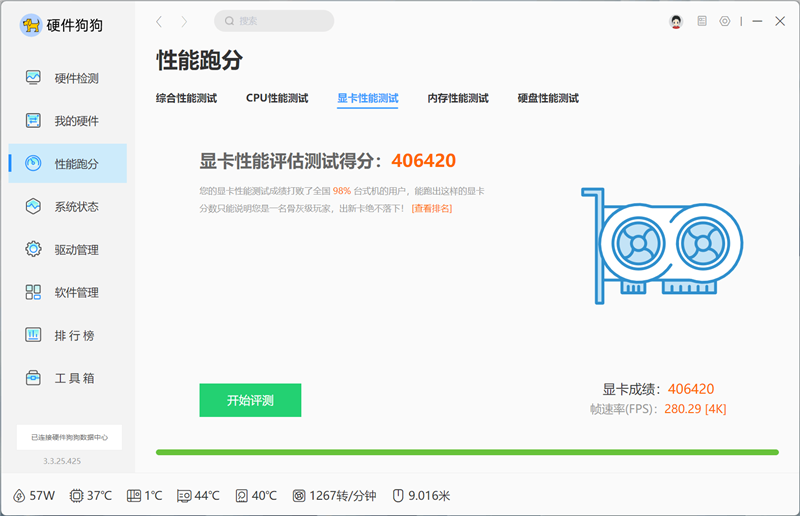 In the Hardware Dog graphics card performance evaluation test, the score was 406420.