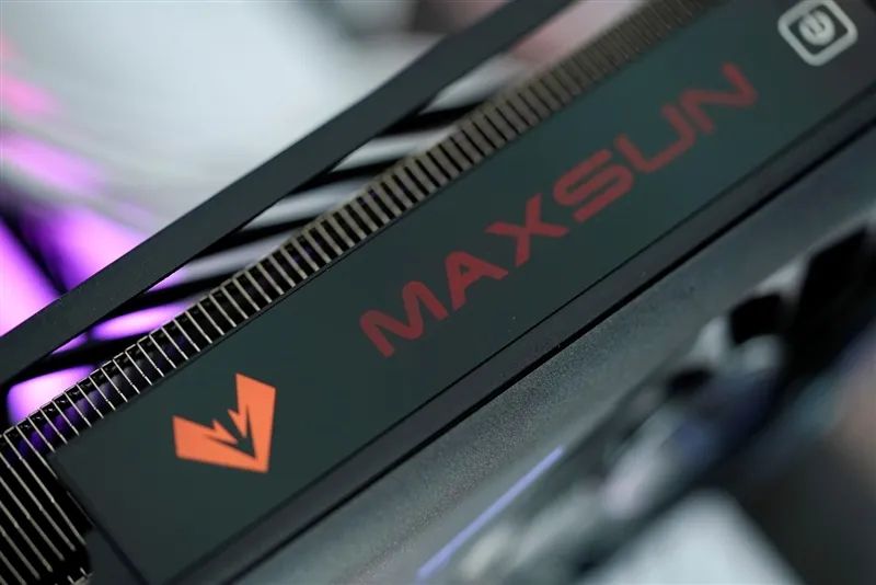 Close-up of the top lighting effects of the Maxsun GeForce RTX 5060 Ti iCraft OC 8GB graphics card.