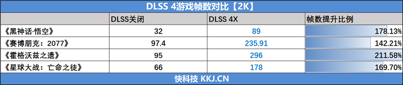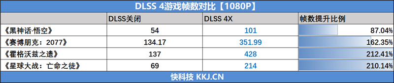 In Black Myth: Wukong, with DLSS 4's highest 4X level multi-frame generation enabled, the average frame rate was 89 at 2K resolution and 101 at 1080P resolution.