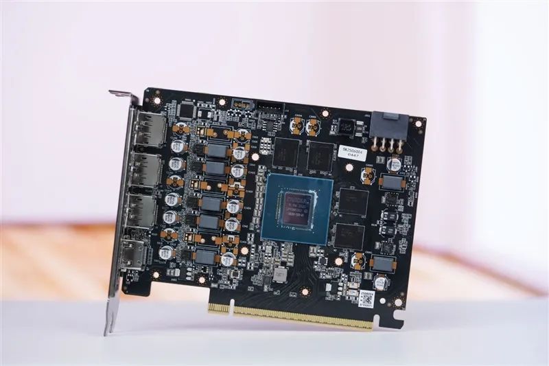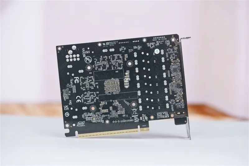 The full view of the PCB board of the Maxsun GeForce RTX 5060 Ti iCraft OC 8GB graphics card. The single-sided design concentrates the main components on the front, and the back is very neat.