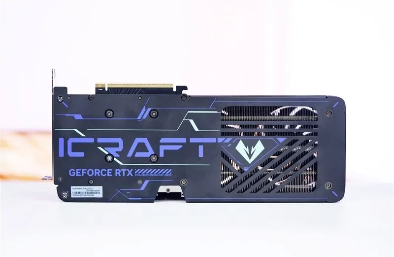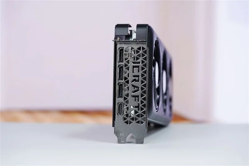 The Maxsun GeForce RTX 5060 Ti iCraft OC 8GB graphics card provides three DisplayPort 2.1b interfaces and one HDMI 2.1b interface. The thickness of the graphics card does not exceed the width of the baffle, and the height exceeds part of the baffle. The cutout in the middle of the graphics card baffle also has the 'iCraft' text.