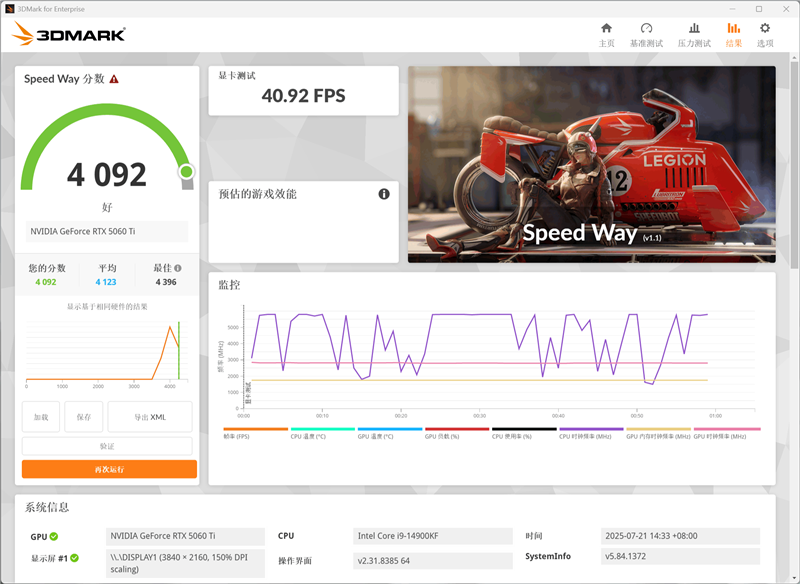 In the Speed Way test for comprehensive performance in 3DMark, the total score is 4092, with a graphics card test score of 40.92FPS.