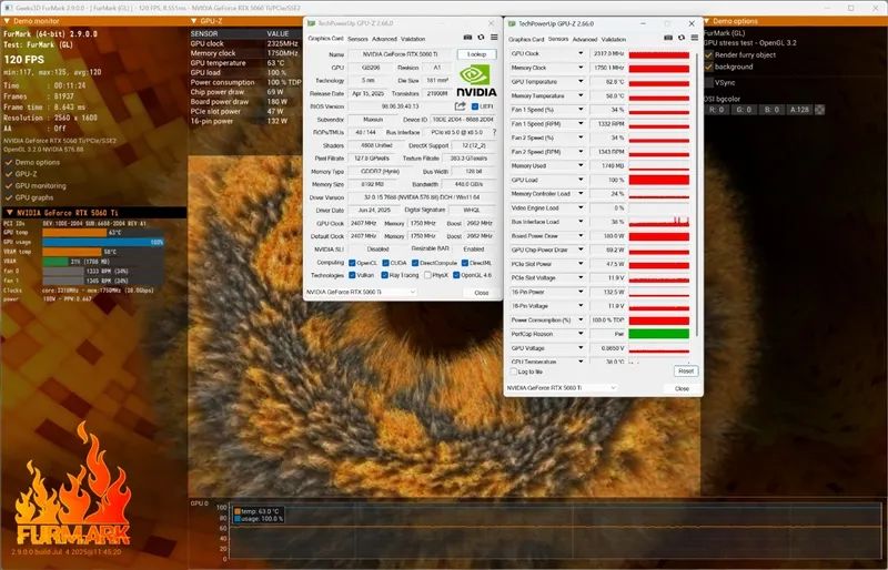 We used Furmark to stress test the Maxsun GeForce RTX 5060 Ti iCraft OC 8GB graphics card for 10 minutes. At a room temperature of approximately 28°C, the card's power consumption stabilized at 180W, with a core frequency of around 2.3GHz and a temperature of 62.6°C, and the fan speed was 1300RPM.