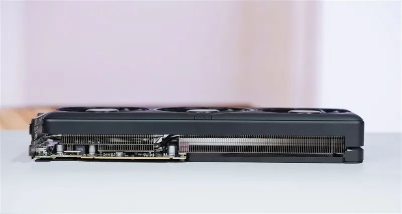 From the side, it can be seen that more than half of the length of the rear half of the Maxsun GeForce RTX 5060 Ti iCraft OC 8GB graphics card is pure heat sink.
