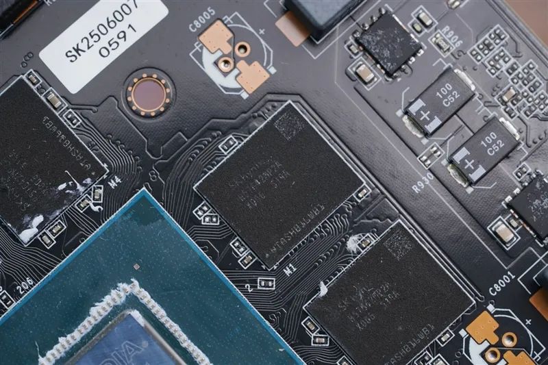 GDDR7 memory chips from Samsung, a total of 4 pieces forming 8GB capacity, arranged around the GPU chip.