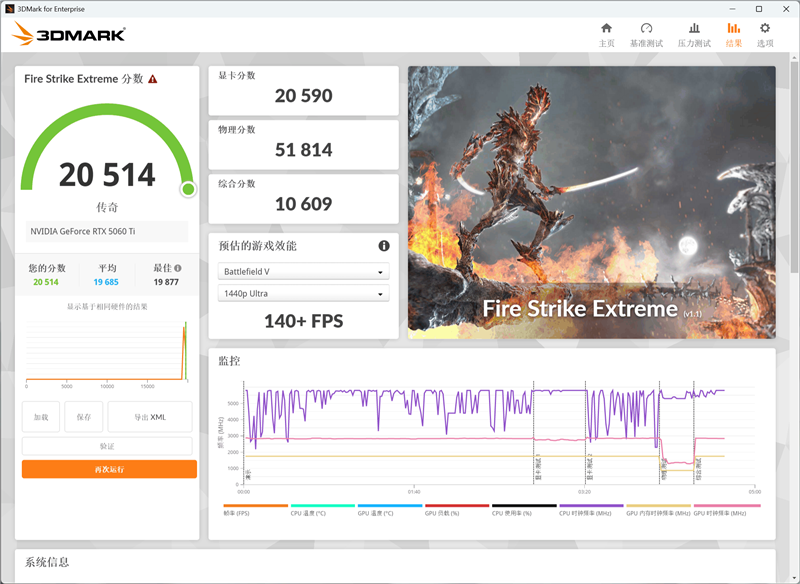 In the 3DMark Fire Strike Extreme (DX11+2K rendering resolution) test, the overall score was 20514, with a graphics card score of 20590.