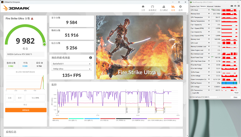In the 3DMark Fire Strike Ultra (DX11+4K rendering resolution) test, the overall score was 9982, with a graphics card score of 9584.