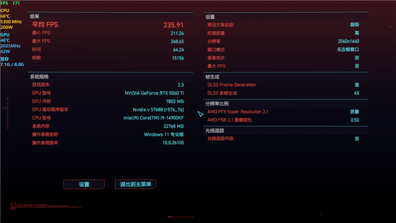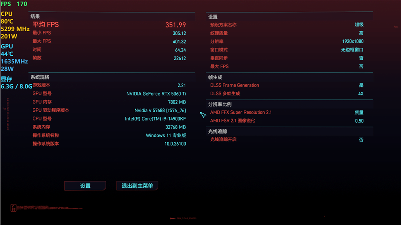 In Cyberpunk 2077, with DLSS 4's highest 4X level multi-frame generation enabled, the average frame rate was 235.91 at 2K resolution and 351.99 at 1080P resolution.