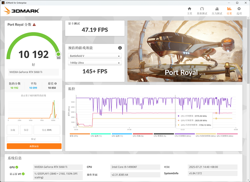 In the Port Royal test for real-time ray tracing performance in 3Dmark, the total score is 10195, with a graphics card test score of 47.19FPS.