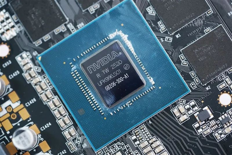 Close-up of the GPU chip of the Maxsun GeForce RTX 5060 Ti iCraft OC 8GB graphics card, with a core code of GB206-300.
